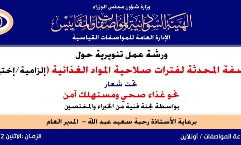 ضمن حملة نحو مستهلك آمن في رمضان .. تقيم الإدارة العامة للمواصفات القياسية- بالهيئة السودانية للمواصفات والمقاييس الورشة التنويرية حول المواصفة المحدثة لفترات صلاحية المواد الغذائية (إلزامية- اختيارية) .. تحت شعار( نحو غذاء صحي ومستهلك آمن- بواسطة لجنة فنية من الخبراء والمختصين – برعاية الأستاذة رحبة سعيد عبد الله- المدير العام- اليوم الاثنين- مكان قاعة المواصفات- اولاين.