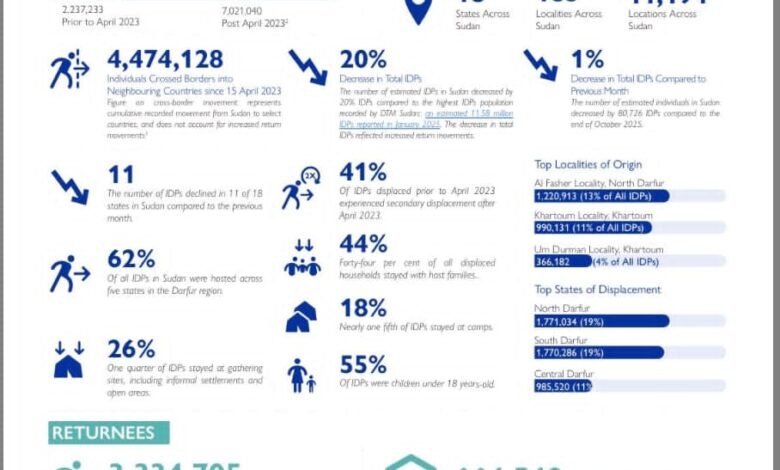 أعلنت المنظمة الدولية للهجرة عن عودة أكثر من ثلاثة ملايين من النازحين واللاجئين إلى ديارهم في السودان بحلول نهاية شهر /نوفمبر/ الماضي.