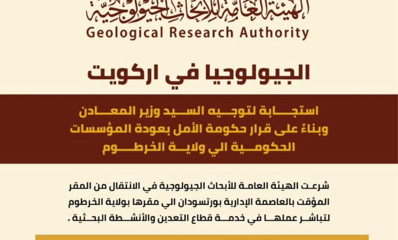 قالت الهيئة العامة للأبحاث الجيولوجية في السودان إنها بدأت إجراءات الانتقال من مقرها المؤقت في بورتسودان إلى مقرها الدائم بولاية الخرطوم، تنفيذًا لتوجيهات وزير المعادن وقرار حكومة الأمل بعودة المؤسسات الحكومية إلى العاصمة.