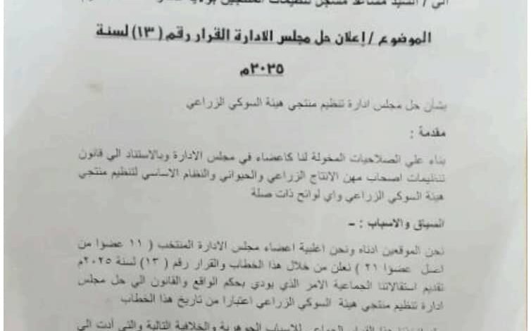 أعلن 11 عضوًا من أصل 21 في مجلس إدارة تنظيم منتجي هيئة السوكي الزراعي باستقالة جماعية، معلنين بذلك حل المجلس رسميًا من خلال القرار رقم (13) لسنة 2025م، استنادًا إلى الصلاحيات القانونية والنظام الأساسي المعمول به.وجاءت هذه الاستقالات نتيجة شلل كامل في عمل المجلس بسبب تعطيلي من قِبل رئيس المجلس الذي رفض الاعتراف بشرعية المجلس وقراراته، وأبدى موقفًا صريحًا برفض تحمل المسؤولية خلال موسم زراعي حساس، إلى جانب فرضه رسومًا إدارية غير مبررة على المزارعين، بالتواطؤ مع الإدارة المكلفة سابقًا.