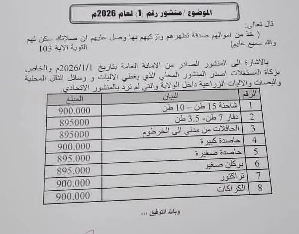 وبموجب المنشور بلغت زكاة الشاحنة حمولة (١٥ – ١٠طن ” ٩٠٠ الف”) و الدفار( ٧-٣.٥طن ” ٨٩٥٠٠٠” جنيه)