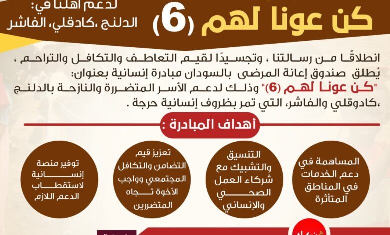 في إطار رسالته وتجسيدًا لقيم التكافل والتراحم، يواصل صندوق إعانة المرضى بالسودان عبر مبادرة “كن عوناً لهم (6)”، في مشروعات دعم الأسر المتضررة والنازحة في مناطق الدلنج، كادقلي، الفاشر.