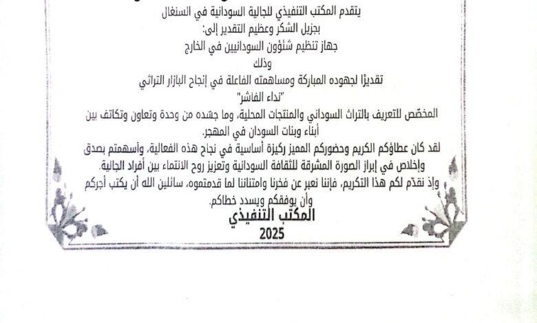 على خلفية نجاح البازار التراثي : جهاز المغتربين يثمن مجهودات الجالية السودانية بداكار