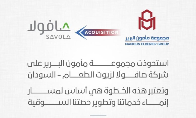 أعلنت مجموعة مأمون البرير اليوم السبت إتمام صفقة الاستحواذ الكامل على شركة صافولا لزيوت الطعام السودان، التابعة لمجموعة صافولا السعودية، عبر إحدى شركاتها الصناعية،وبموجب الاتفاق تنتقل ملكية الشركة بنسبة 100% إلى مجموعة مأمون البرير، لتشمل الصفقة جميع الأصول والاستثمارات داخل السودان، بما في ذلك المصانع والمنشآت الصناعية والاستثمارات الزراعية وسلاسل الإمداد والتوزيع، إضافة إلى العلامات التجارية وحقوق الملكية الفكرية المرتبطة بالشركة داخل البلاد.