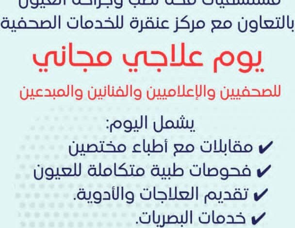 تنظم مستشفى مكة لطب العيون بامدرمان يوما علاجياً (مجاناً) غدا الجمعة مخصصا للصحفيين والإعلاميين والفنانين والمبدعين، بالتعاون والتنسيق مع مركز عنقرة للخدمات الصحفية، ومؤسسة البصر العالمية وذلك تحت رعاية سعادة الفريق مالك عقار إير نائب رئيس مجلس السيادة الانتقالي.