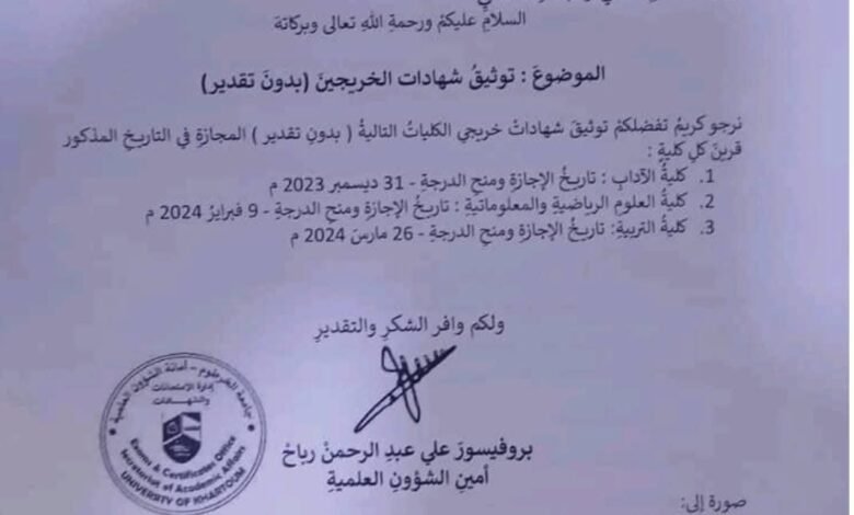 ثالثاً، رفض طلب توثيق شهادات دفعة 2023-2024 “بدون تقدير” في مايو 2024، لأنه يمس سلامة الوثائق الأكاديمية.